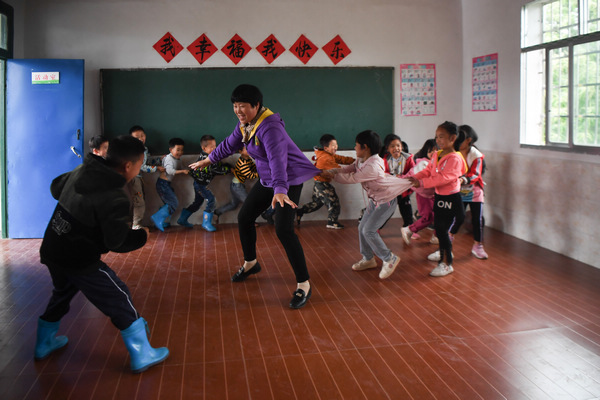 杨文清在登云寨教学点的活动室陪学生们做游戏。新华社记者薛宇舸 摄