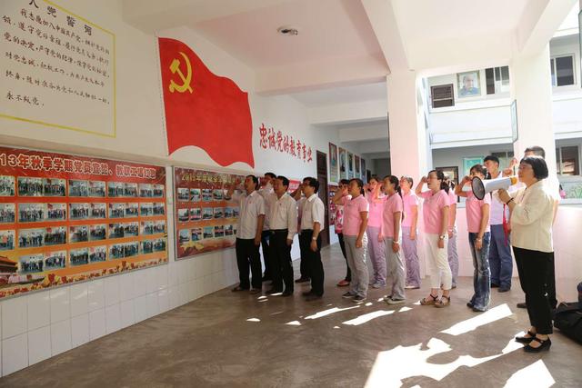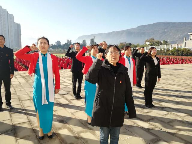 张桂梅(右一)带领党员教师重温入党誓词。图片来源:人民日报客户端
